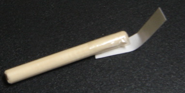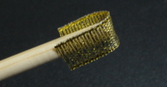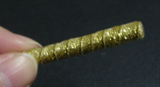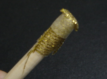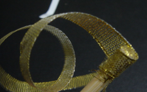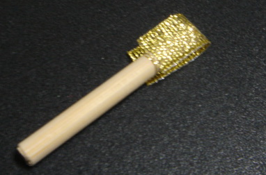 1.竹筷手把一端先黏雙面膠,把金色緞帶剪一小段黏上去之後再把黏一圈雙面膠,剩下的金色緞帶纏繞整支竹筷手把.