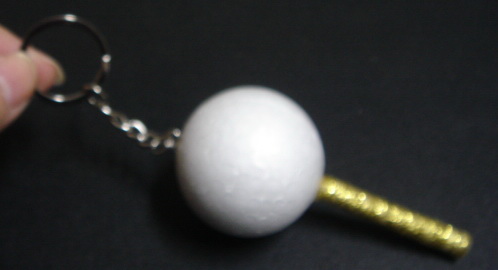 2.將竹筷手把插進保麗龍球內,再來將鑰匙圈羊眼的部分黏在頂端位置,用熱熔膠將二樣黏住即可!