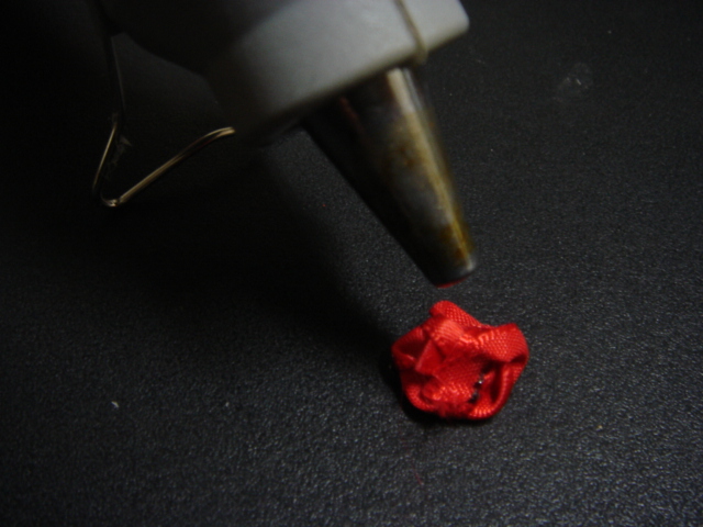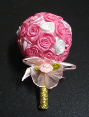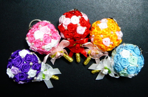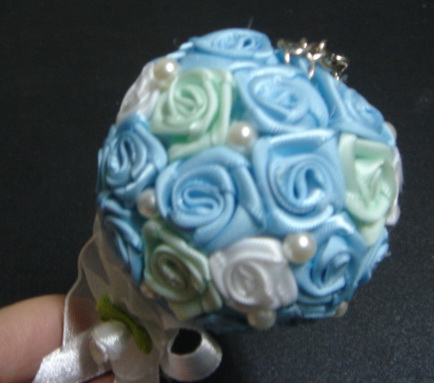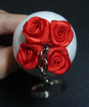 3.再來就是黏小花,從鑰匙圈處先黏,把整個保麗龍球黏滿小花..要注意配色喔!後黏上蝴蝶結.